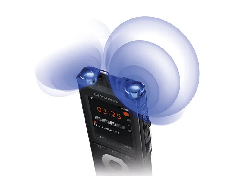 Der DS-9500 verfügt über integrierte Stereomikrofone mit drei Modi. Wählen Sie aus drei Mikrofonempfindlichkeitsoptionen entsprechend Ihren Aufnahmeanforderungen. Dictation 1 erfasst Audio in einem 360-Grad-Radius, ideal für ruhige Umgebungen. Dictation 2 nutzt die Geräuschunterdrückung, um Hintergrundgeräusche herauszufiltern. Darüber hinaus passt der Konferenzmodus die Aufnahmepegel automatisch an die Lautstärke der Stimmen der Sprecher an.