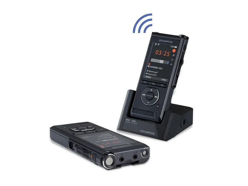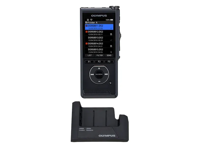 Die CR-21 Dockingstation sorgt für eine reibungslose Verbindung zu Ihrem PC. In Verbindung mit einem Olympus-Netzteil lädt es den DS-9500 innerhalb von 2 Stunden effizient auf. Darüber hinaus haben Sie die Möglichkeit, einen Fußschalter zur Fernsteuerung des Geräts anzuschließen und so das freihändige Diktieren zu ermöglichen. Darüber hinaus dient der LAN-Netzwerkanschluss der Dockingstation als Backup-Lösung für den Datenaustausch, wenn kein WLAN verfügbar ist.