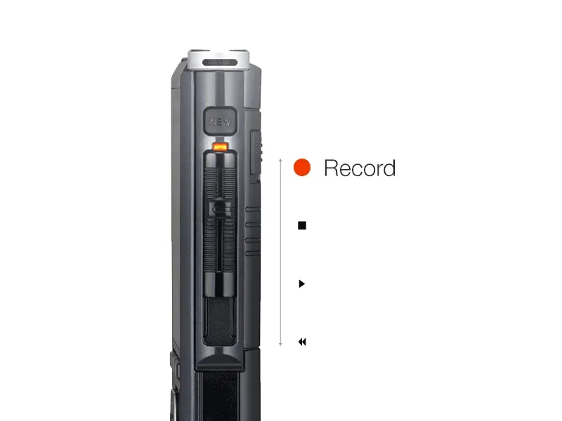 Der Schiebeschalter ermöglicht eine mühelose Bedienung, sodass Sie sich voll und ganz auf das Diktieren konzentrieren können. Starten, stoppen und bearbeiten Sie Aufnahmen ganz einfach, ohne auf das Gerät zu schauen.